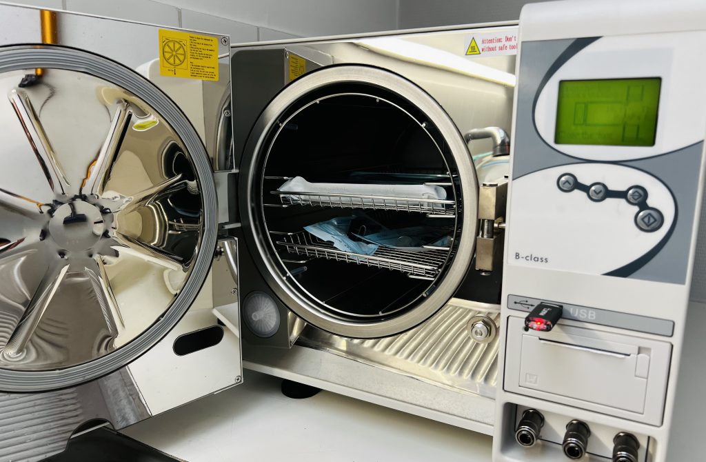 Après décontamination, nettoyage et séchage, ils sont emballés sous sachets étanches et stérilisés en autoclave de classe B, qui effectue un pré-vide et un post-vide, permettant une stérilisation à l’intérieur des instruments creux si nombreux en dentisterie.